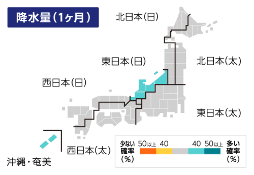 例年と同様に、天気は数日の周期で変化する見込みです。全国的に降水量はおおむね平年並みとなる予想ですが、湿った空気の影響を受けやすい東日本の日本海側や沖縄・奄美では、平年をやや上回る見込みです。