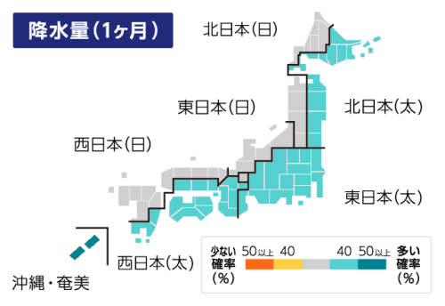 今週末と11月初めには、本州付近を発達した低気圧が通過する見通しです。低気圧に向かって湿った空気が流れ込む影響で、太平洋側の広い範囲で降水量が多くなる見込みです。同様に、11月上旬にかけて前線の影響を受けやすい沖縄・奄美も平年を上回る見通しです。