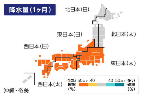 11月最終週から12月上旬にかけて、移動性高気圧に覆われる日が多く降水量は平年を下回る見通しです。北日本では来週は雪や雨の降る所が多くなる見込みですが、その後は周期的に天気が変化し、期間全体としては概ね平年並みとなるでしょう。