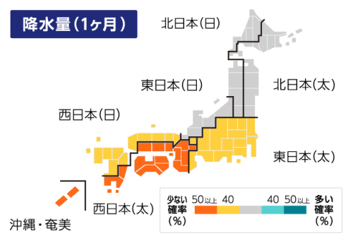 期間の前半は、高気圧が移動性となって南海上を進む傾向が続く見通しです。そのため、西日本や東日本の太平洋側では、降水量が平年を下回る見込みです。場所によっては、水不足の深刻化が懸念されます。
