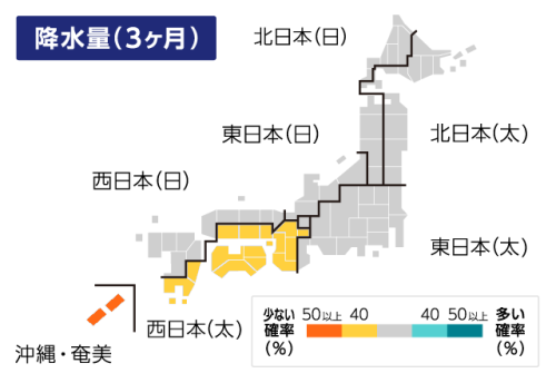 向こう3ヶ月(2月~4月)の降水量は、日本の南で北東風が平年より強く、南西からの湿った空気や低気圧の影響を受けにくいことから、沖縄・奄美では平年より少なく、西日本太平洋側では平年並みか少ない予想です。昨年12月末以降、東日本太平洋側や西日本、沖縄・奄美では降水量が少なくなっています。既に少雨傾向となっている地域が多くあるため、空気の乾燥や火の取り扱いに十分ご注意ください。