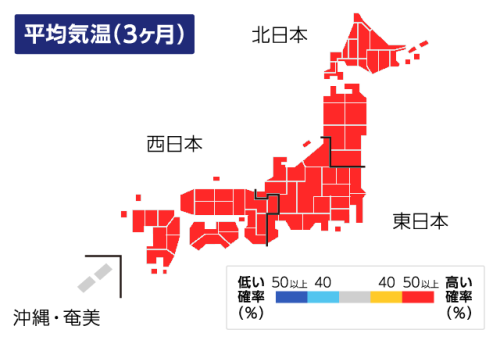 向こう3ヶ月(2月~4月)の平均気温は、日本付近上空の偏西風が期間の後半を中心に平年より北を流れやすく寒気の影響を受けにくいことから、北・東・西日本で平年より高くなる見込みです。昨年同様に季節進行は早く、春の訪れは早まる予想です。なお、2月頃にかけては全国的に平年並みの気温となり、一時的に強い寒気が流れ込んで冬らしい寒さが続くでしょう。